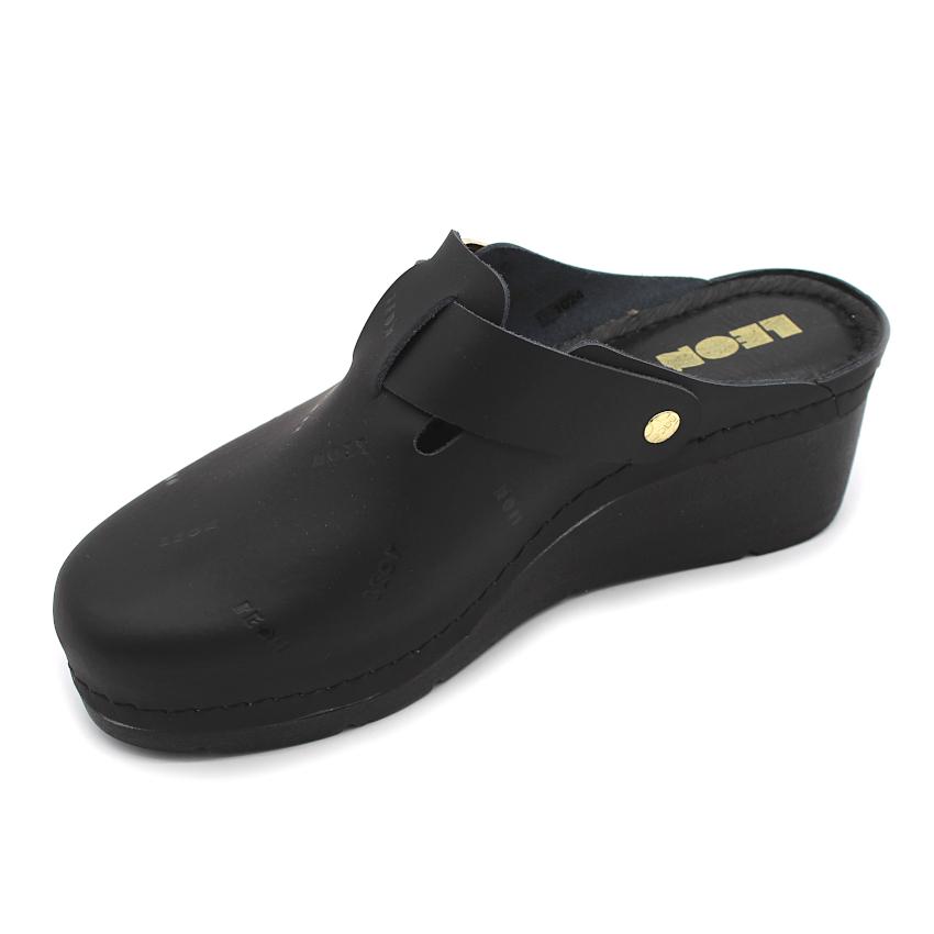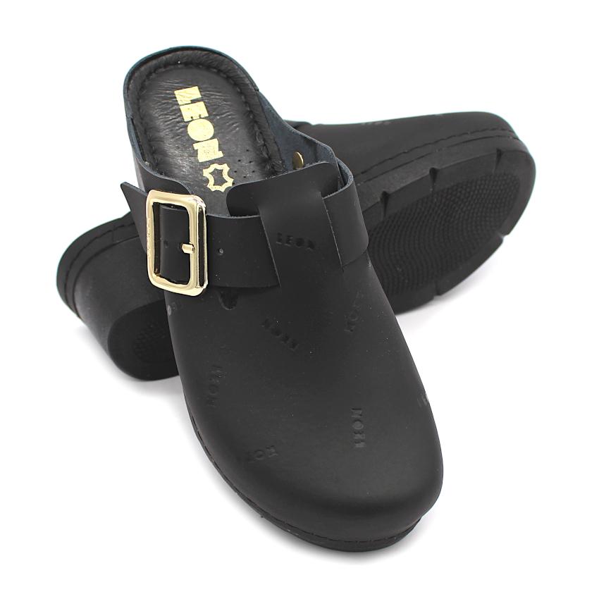Női bőr klumpa, műanyag csúszásgátlós talppal. Oldalt csat található, amellyel szabályozni lehet a bőséget. A talpbetét puha zselés, bőr. A természetes anyagnak és a felsőrész lyukacsosságának köszönhetően, jól szellőzik. Ajánlott: mindennapos utcai használatra, otthonra vagy munkahelyre ( több órás, szaladgálós munka alatt sem fárad el a láb ).