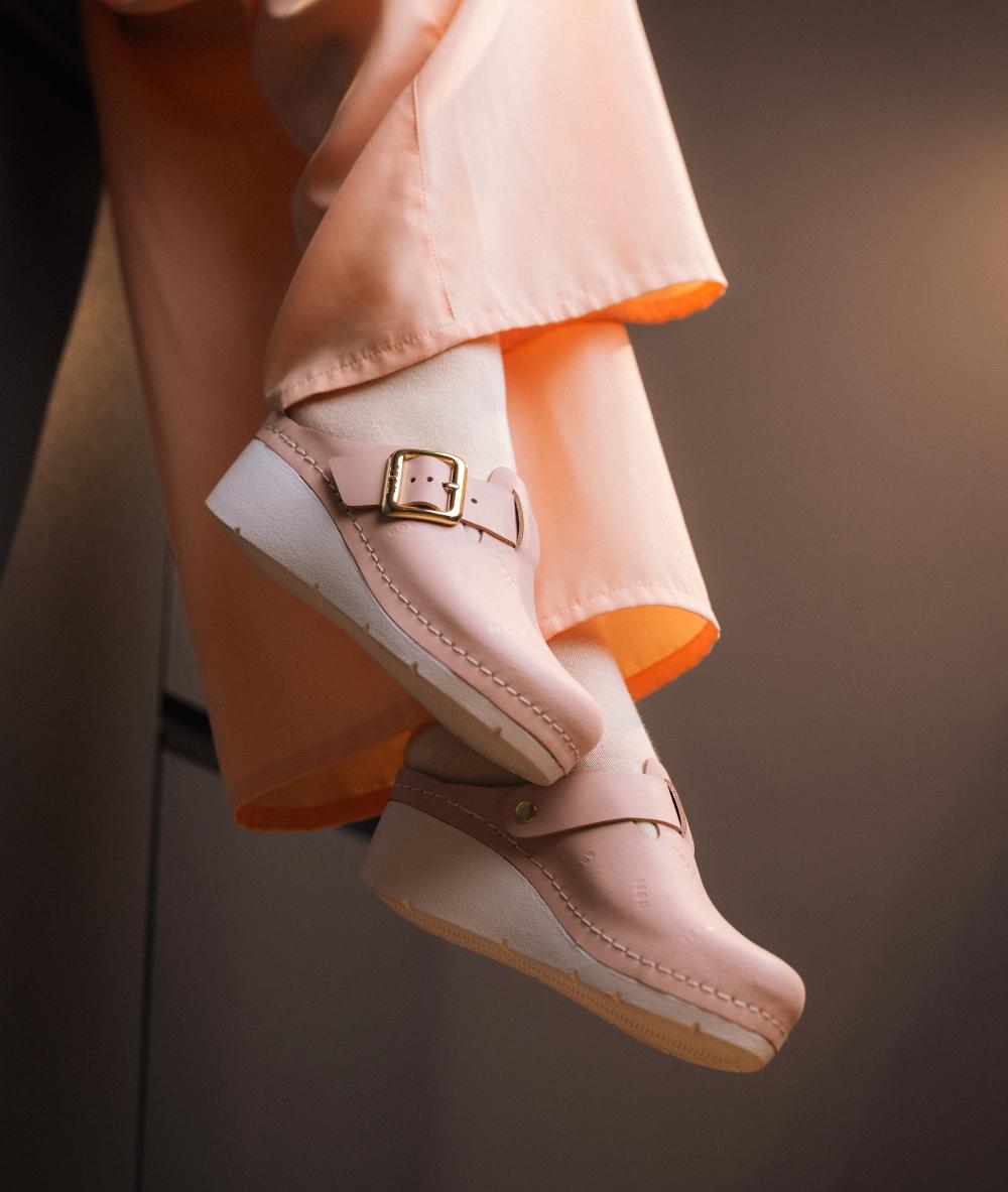 Női bőr klumpa, műanyag csúszásgátlós talppal. Oldalt csat található, amellyel szabályozni lehet a bőséget. A talpbetét puha zselés, bőr. A természetes anyagnak és a felsőrész lyukacsosságának köszönhetően, jól szellőzik. Ajánlott: mindennapos utcai használatra, otthonra vagy munkahelyre ( több órás, szaladgálós munka alatt sem fárad el a láb ).