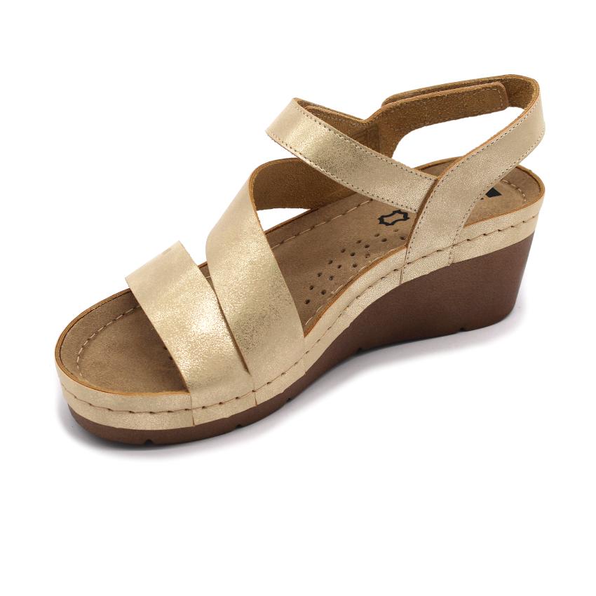 Dekoratív női bőr szandál, műanyag talppal. A talpbetét puha, zselés, bőr. Ajánlott minden napos utcai használatra, könnyű nyári sétára ( több órás gyaloglás után sem fárad el a láb ).