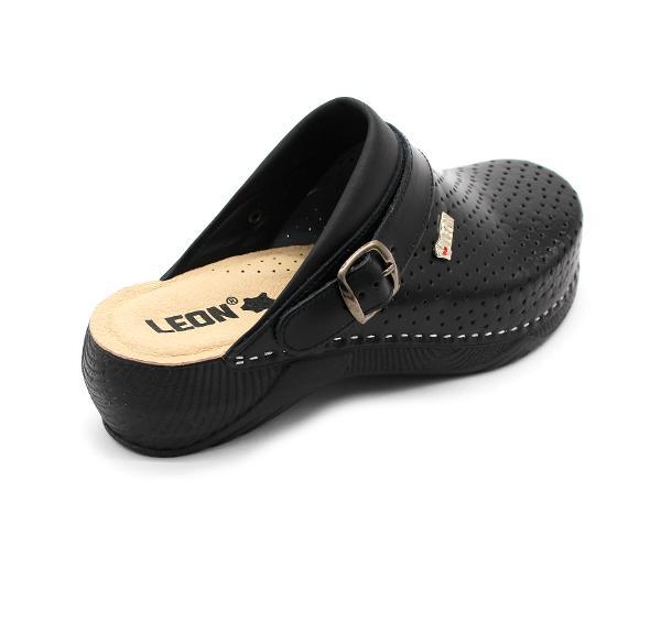Női bőr klumpa, műanyag, ruganyos talppal, amely az alsó részén csúszásgátlóval rendelkezik. A