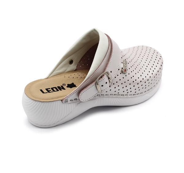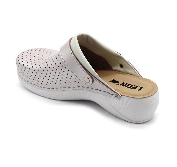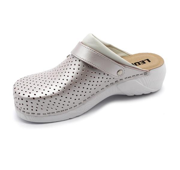 Női bőr klumpa, műanyag, ruganyos talppal, amely az alsó részén csúszásgátlóval rendelkezik. A