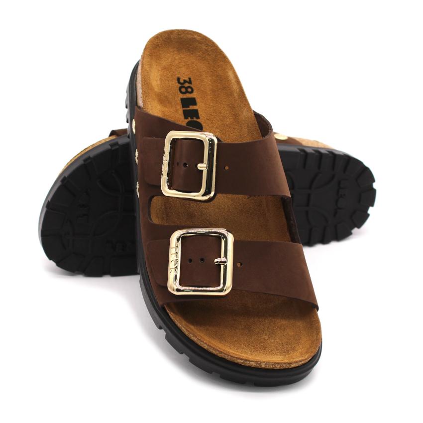Női nyitott, bőr papucs, amely követi a legújabb divat trendeket.