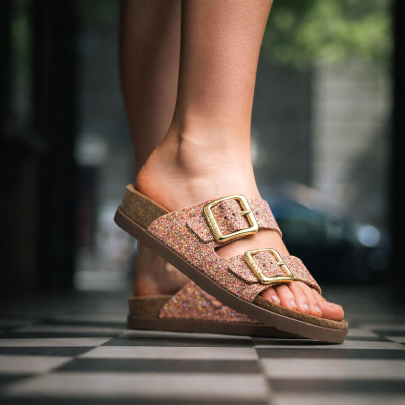 A felsőrész, a csatoknak köszönhetően, a lábhoz igazítható. A talp anatómiai kialakítású parafa, puha velúrbőr talpbetéttel és habszivacs alsó résszel. Ajánlott mindennapos otthoni vagy utcai használatra, könnyű nyári sétára.