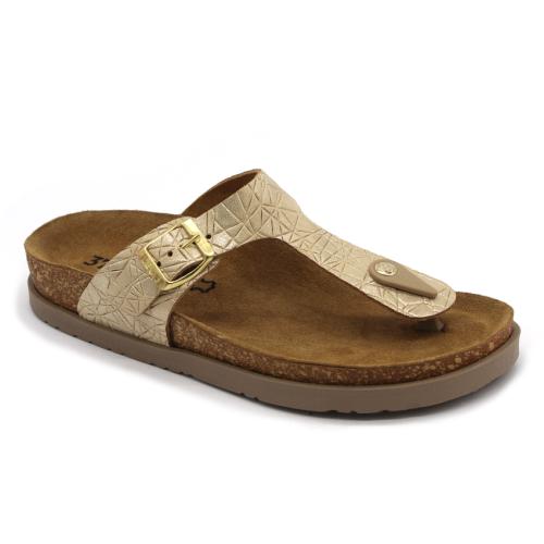 Női bőr, láb ujj köztes papucs, műanyag csúszásgátlós talppal. A szíj bősége csattal szabályozható. A talp anatómiai kialakítású parafa, puha velúrbőr talpbetéttel és csúszásmentes habszivacs alsó résszel. Ajánlott minden napos otthoni vagy utcai használatra, könnyű nyári sétára ( több órás gyaloglás után sem fárad el a láb ).