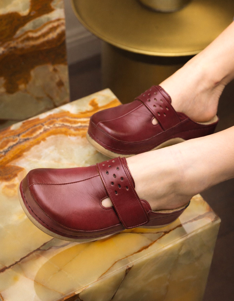 Női nappa bőr (nagyon puha felsőrész) klumpa, műanyag csúszásgátlós talppal. Oldalt tépőzár található, amellyel szabályozni lehet a bőséget. A talpbetét puha zselés, bőr. A természetes anyagnak köszönhetően jól szellőzik. Ajánlott: mindennapos utcai használatra és otthonra.