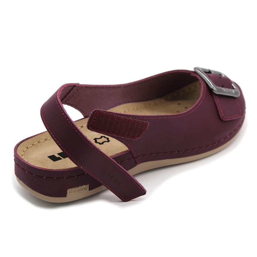 Női bőr szandál, műanyag csúszásgátlós talppal. Az első szíj csattal szabályozható, hátsó szíj tépőzárral kapcsolható. A talpbetét puha zselés, bőr. Ajánlott mindennapos utcai használatra, könnyű nyári sétára ( több órás gyaloglás után sem fárad el a láb ).